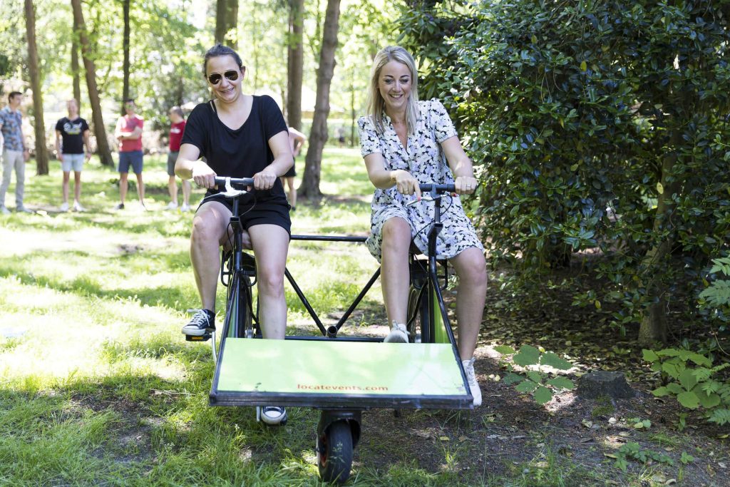 Op deze duo-bike is er geen stuur. Trappen, remmen en samenwerken zijn de ingrediënten om sneller te zijn dan je tegenstander.