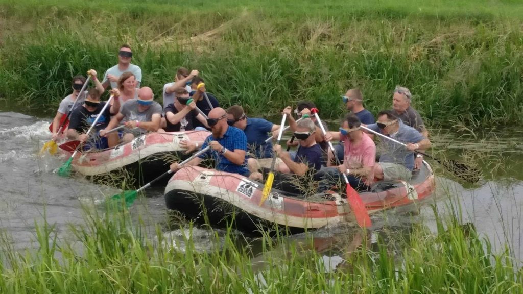 Elke deelnemer krijgt een peddel, reddingsvest en een blinddoek . De kapitein zal zijn “blind” team coachen naar de finish.